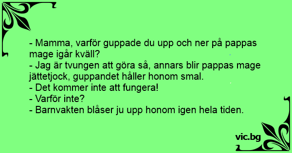 Fritzchen überrascht die Eltern beim Sex. Die Mutter sitzt gerade auf dem Vater. Als der Junge naiv fragt, was die beiden da täten, antwortet die Mutter schnell: „Äh, ich versuche nur Papas Bauch...