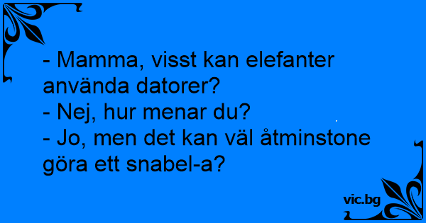 - Mamma, visst kan elefanter använda datorer?<br />- Nej, hur menar du?<br />- Jo, men det kan väl åtminstone göra ett snabel-a?