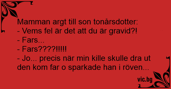 - Jo... precis när min kille skulle dra ut den kom far o sparkade han i röven...