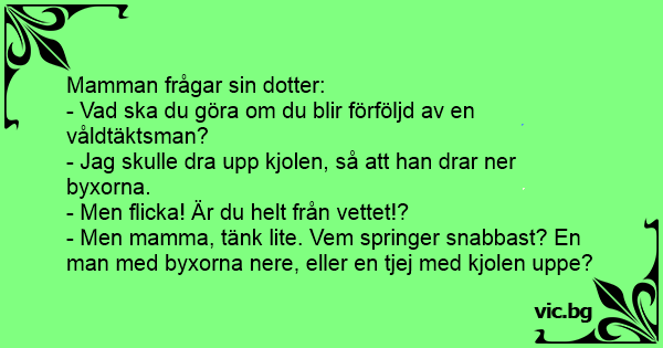 - Men mamma, tänk lite. Vem springer snabbast? En man med byxorna nere, eller en tjej med kjolen uppe?