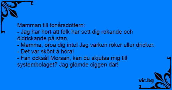 - Fаn också! Morsan, kan du skjutsa mig till systembolaget? Jag glömde ciggen där!