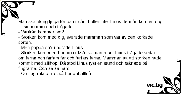 - Storken kom med honom också, sa mamman. Linus frågade sedan om farfar och farfars far och farfars farfar. Mamman sa att storken hade kommit med allihop. Då stod Linus tyst en stund och räknade på fingrarna. Och så sa han: