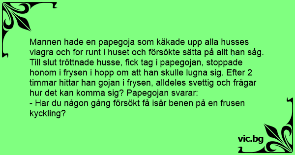 Mies sai lääkäriltä paketin viagraa. Ennenkuin mies ehti ottaa yhtään, tämän puhuva papukaija söi koko paketin. Lääkkeen mahdollisesta vaikutuksesta pelästyneenä mies laittoi linnun pakastimeen...