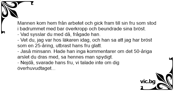 - Vet du, jag var hos läkaren idag, och han sa att jag har bröst som en 25-åring, utbrast hans fru glatt.