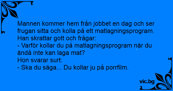 Żona ogląda w telewizji program o gotowaniu. Mąż z przekąsem: - Nie pomoże Ci. I tak nie umiesz gotować. Żona nie odrywając wzroku od ekranu: - I to mówi ten, co ciągle ogląda pornosy.