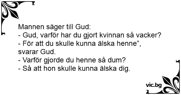 Adam wandelt voor de zondeval met God in de hof van Eden. Adam: "Waarom heeft u me eigenlijk zo'n mooie vrouw gegeven?" God: "Zodat jij van haar zou gaan houden." Adam: "Maar hoe komt het dan dat u...
