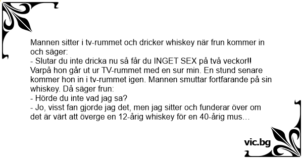 Mannen sitter i tv-rummet och dricker whiskey när frun kommer in och säger: