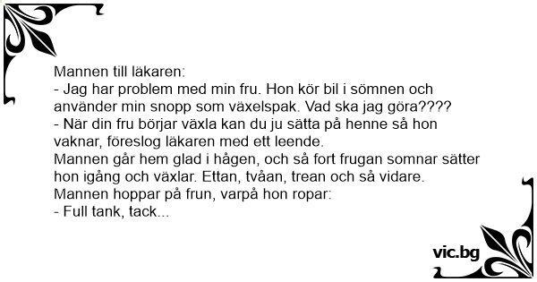 - Jag har problem med min fru. Hon kör bil i sömnen och använder min snopp som växelspak. Vad ska jag göra????