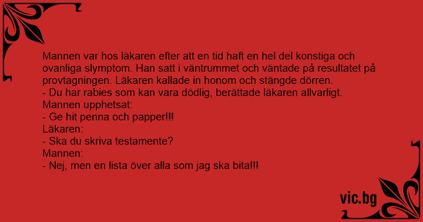 Mannen var hos läkaren efter att en tid haft en hеl del konstiga och ovanliga slymptom. Han satt i väntrummet och väntade på resultatet på provtagningen. Läkaren kallade in honom och stängde dörren.