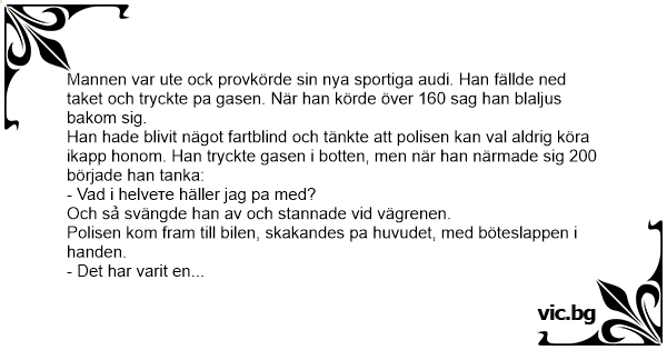 Мъж си купил ново БМВ и го подкарал с висока скорост. Полиција, по потера, успева да застане еден возач. Полицаецот излегува од возилото и му се обраќа на возачот: A man in his mid forties bought a new BMW and was out on the interstate for a nice evening drive. A police officer attempts to stop a car for speeding and the guy gradually increases his speed until he's topping 100 mph. One evening a old man is traveling at 70mph in a 30mh zone a little further down the road. Nach einer schnellen Verfolgungsjagd stoppt die Polizei Vlad. „So viel Spaß hatte ich den ganzen Tag nicht“, sagt der Polizist. „Wenn Sie eine gute Entschuldigung haben, lassen wir das mit dem Strafzettel.“ „Vor drei Wochen hat mich meine Frau wegen eines Polizisten verlassen“, erklärt Vlad.... Porsche Fahrer Ein Porsche Fahrer fährt mit ca. 250 km/h auf der Autobahn trotz Geschwindigkeitsbegrenzung auf 100 km/h. Er wird von einem Streifenwagen verfolgt. Nach einer halben Stunde wilder Verfolgungsjagd stoppt er endlich. Der Polizeiobermeister sagt: „OK, wenn sie mir eine Ausrede... Mannen var ute och provkörde sin nya sportiga Porsche. Han fällde ned taket och tryckte på gasen och när han körde över 120 km/h såg han blinkande blåljus bakom sig. Han hade blivit något fartblind... Een man heeft een nieuwe Mercedes gekocht en gaat op een mooie zomeravond even lekker een stuk rijden... Het dak eraf, de wind glijdt door zijn haar en hij besluit eens te kijken hoe hard zijn... Um homem é parado pela polícia depois de ser perseguido em alta velocidade: - Sabe, foi a coisa mais divertida que me aconteceu hoje - diz o policial. Se me der uma boa desculpa, não registro a... "Waar ben ik godsnaam mee bezig?" denkt hij en hij gaat naar de kant van de weg. De agent loopt naar hem toe, pakt zijn rijbewijs zonder ook maar iets te zeggen, bekijkt zijn rijbewijs en auto... Um sujeito está voltando para casa, dirigindo acima da velocidade permitida. Olhando pelo retrovisor, ele vê um carro de polícia buzinando, com um guarda fazendo gestos obrigando-o a parar. Ele... Starszy pan mknie autem przez miasto z prędkością 180km/h. Goni go policja, a stróż prawa krzyczy: - Zwariował pan? Muszę panu teraz zabrać prawo jazdy. Chyba że potrafi się pan jakoś sensownie z... En man hade köpt sig en ny sportbil och var ute på motorvägen för att testa lite. När han var uppe i 160 så upptäckte han blåljus i backspegeln och tänkte: - ...snuten hinner aldrig ifatt mig i... En mand kommer kørende i sin bil med 125 km/t Pludselig ser han en motorcykel betjent i bakspejlet og øger hastigheden til 200 km/t. Da politibetjenen bliver ved med at følge efter opgiver manden... Mężczyzna około 40-tki pomykał szosą w swoim nowiutkim Porsche. Kiedy już dwukrotnie przekroczył dozwoloną prędkość, we wstecznym lusterku zobaczył charakterystyczne czerwono-niebieskie migające... Egy fickó vett egy új sportautót, és vidáman hajtott vele hazafelé az autópályán. Gondolta, kipróbálja, mit tud az új verda. Beletaposott a gázba, és a sebességmérő azonnal felment 200-ra. Nem... Egy középkorú pasi éppen depressziós fázisban van, ezért úgy dönt, hogy egy kicsit feldobja a hangulatát, és vesz magának egy tűzpiros Porsche-t. Beül az új verdába, felhajt az autópályára, és... Nusiperka bachūriukas naują mersą. Nori pasibandyt - tai išvaro į kelią ir lekia neblogu greičiu. Rodyklė rodo 120, 130. Žiūri mentas paskui varo su įjungtom mirgalkėm. Galvoja nafik, pabėgsiu.... O sujeito finalmente conseguiu realizar o seu sonho de comprar um Audi A4 , 1.8T, automático, conversível e blá, blá, blá .. Então, numa bela tarde, se mandou para uma auto-estrada para testar toda... Žmogelis nusipirko naują Mersedesa – kabrioletą ir viena vakarą nusprendė išbandyti ji. Išvažiavo į užmiesčio kelia, atidarė stogą ir nuspaudė akseleratoriaus pedalą. Spidometro rodyklė rodė 140.... - Uram, mondjon egy olyan indokot, amit még nem hallottam, hogy miért lépte túl a megengedett sebességet, és elengedem! - Tavaly elhagyott a feleségem egy rendorért. Azt hittem, hogy maga az, es...