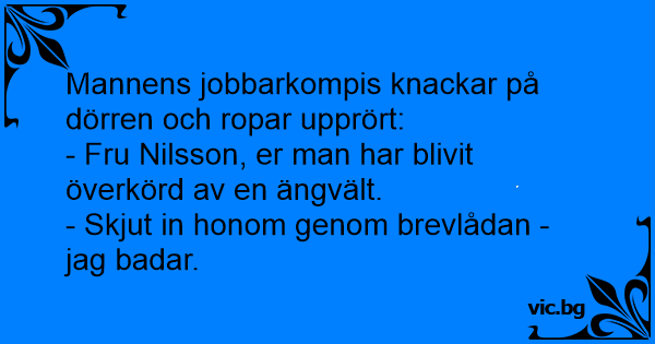 Звъни се на вратата. - Кой е? - Полиция госпожо, мъжът ви го прегази валяк.. - Пъхнете ми го под вратата, в банята съм..!