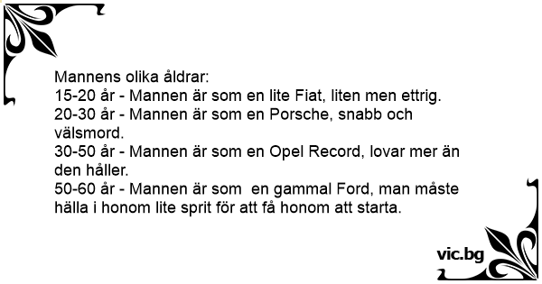 50-60 år - Mannen är som en gammal Ford, man måste hälla i honom lite sprit för att få honom att starta.