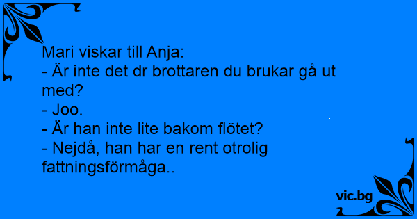 Mari viskar till Anja: - Är inte det dr brottaren du brukar gå ut med? - Joo. - Är han inte lite bakom flötet? - Nejdå, han har en rent otrolig fattningsförmåga..
