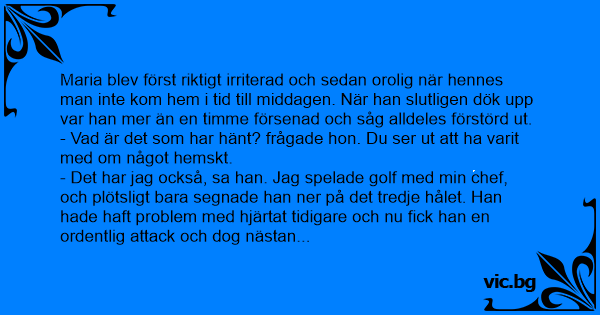 John jak zwykle w sobotę udał się na partyjkę golfa. Żona zaczęła się martwić, gdy nie wrócił o zwykłej porze. Robiło się coraz później. W końcu wybiła 23.00 kiedy mąż przyjechał. Wystraszona żona...