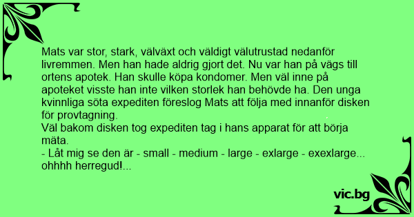 Mats var stor, stark, välväxt och väldigt välutrustad nedanför livremmen. Men han hade aldrig gjort det. Nu var han på vägs till ortens apotek. Han skulle köpa kondomer. Men väl inne på apoteket visste han inte vilken storlek han behövde ha. Den unga kvinnliga söta expediten föreslog Mats att följa med innanför disken för provtagning.