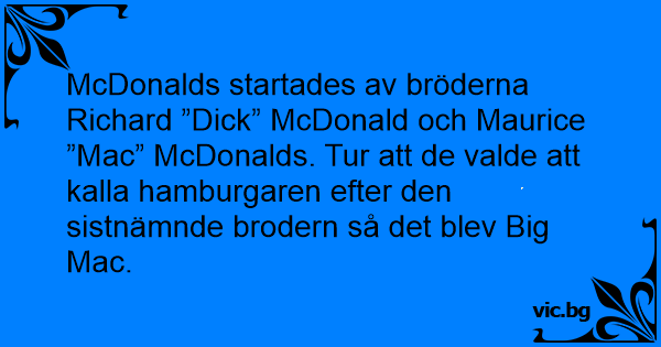 McDonalds startades av bröderna Richard ”Diск” McDonald och Maurice ”Mac” McDonalds. Tur att de valde att kalla hamburgaren efter den sistnämnde brodern så det blev Big Mac.
