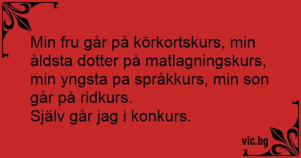 Min fru går på körkortskurs, min åldsta dotter på matlagningskurs, min yngsta pa språkkurs, min son går på ridkurs.