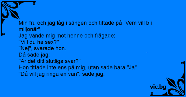 Η γυναίκα μου και εγώ βλέπαμε το «Ποιός Θέλει Να Γίνει Εκατομμυριούχος», ξαπλωμένοι στο κρεβάτι μας. Γύρισα και τη την ρωτάω: - Θέλεις να κάνουμε σεξ; - Όχι, απαντά η γυναίκα μου. - Είναι αυτή η...