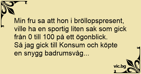 La maquina de los tres segundos Η ζυγαριά. Η επέτειος. Скъпи, за рожденият си ден искам нещо такова, че като стъпя на педала му да вдига до 100 за под три секунди! Жена ми започна да подмята какво иска за подарък за предстоящата ни годишнина: Милий, подаруй мені на 8 Березня, щось таке, що б ніжкою трохи придавила, а воно так раз, і від нуля до сотні за 3 секунди! Un Allemand, un Hollandais et un Belge sont assis dans le café. L'Allemand annonce fièrement : Une femme, peu avant Noel dit à son mari qu'elle aimerait recevoir quelque chose capable de monter de 0 à 100 en plus ou moins 4 secondes... My wife and I will be celebrating our wedding anniversary soon so i asked her what she wanted. She said wanted something really really shine that goes from 0 to 200 in about 3 seconds. Είναι τρεις τύποι λέει ο πρώτος A l’approche de Noël, un homme qui souhaite se voir offrir une moto donne des indices à sa femme : Treffen sich zwei Blondinen. Sagt die eine: My wife said wanted something shiny that went from 0-150 in under 2 seconds. Kommt meine Frau heute in den Garten nachdem sie den neuen BMW der Nachbarin erblickt hat: "Du, Hans, ich brauch auch so ein Ding mit dem ich innerhalb von fünf Sekunden auf Hundert komme!" "Naja, so habe ich ihr eine Badzimmerwaage gekauft..." Adam och Jonatan satt och skröt för varandra. Adam sa: - Min pappa har en sportbil som går från 0 till 100 km på sju sekunder. Jonatan kontrar: - Det var väl inget. Min pappa har en apparat som går från 0 till 100 på bara en sekund. - Du... Una esposa descontenta con su carro le dice a su marido: - Cariño, el día de San Valentín sorpréndeme y regálame algo que pase de 0 a 100 en 4 segundos, de ser posible de color azul. El marido le... — Любий! Подаруй мені те, що за 4 секунди розганяється від 0 до 100. — Ваги? - Hvad er det accelererer fra 0-100 på 0,5 sekunder? - Badevægten, når min svigermor bestiger den! - Kona ga meg et hint om hva hun ønsket seg på sin 50 års dag. - Hun sa at ønsket seg noe skinnende som går fra 0 til 100 på 3 sekunder. - Hva kjøpte du da? - Jeg kjøpte en baderomsvekt til henne. Tre drenge Tre drenge stod på et gadehjørne. Pludselig siger den ene: - Min far har en bil, der kan accelerere fra nul til hundrede på 6 sekunder. Den anden dreng siger: - Min far har en bil, der... 3 Vrienden zitten bij mekaar en ze praten over wat ze voor hun vrouw als verjaardagscadeau hebben gekocht. Zegt de eerste: "Ik heb voor mijn vrouw iets gekocht dat van 0 naar 100 gaat in 5... Mijn vrouw gaf me laatst een tip voor wat ze wenste voor haar volgende verjaardag.Ze zei: "Ik wil een rode en hij moet van 0 naar 130 gaan in 3 seconden." Ik kocht voor haar een weegschaal.Toen is... Vaimo tuli kotiin töistä ja sanoi miehelleen: - Kulta, minä haluaisin jotain pientä, metallinhohtoista joka kiihtyy muutamassa sekunnissa nollasta sataan. Seuraavana päivänä vaimo sai upeasti... Viime vuonna Pertti ei tiennyt mitä ostaa vaimolleen joululahjaksi. Vaimo antoi mielestään hyvän vihjeen: ”Olisi kiva jos tossa autotallin edessä olisi minulle sellainen lahja, joka menee nollasta... Mies oli autuaasti unohtanut vaimon syntymäpäivän ja vaimo naama punaisena huutaa pihalla: PRKL, jos huomenaamuna autotallin oven edessä ei ole jotain uutta, punaista ja mistä neula nousee 5... Nainen pyysi mieheltään syntymäpäivälahjaksi jotain mikä kiihtyisi nollasta sataan 3 sekunissa. - Mies toi vaa’an naiselle. Megkérdeztem a nejemet mit szeretne a születésnapjára. Azt mondta, legyen piros és 3 mp alatt gyorsuljon 0-ról 100-ra. Vettem neki egy piros fürdőszobamérleget. Azóta nem áll velem szóba. Elle voulait un truc qui va de 0 à 100 en 2 secondes, je lui ait offert une balance, c'est là que notre dispute à commencé... - A feleségem meglátta a szomszéd nejének az új BMW-jét, azóta nyaggat, hogy vegyek neki valamit, amivel gyorsabban van százon, mint 5 másodperc. Vettem neki egy fürdőszobamérleget. A mulher faz aniversário e pede para o marido um presente. O que você quer de presente? Um que vai de 0 a 100 em 10 segundos. À noite o marido traz uma caixa e diz: — Seu presente está aqui! Ela... Tre killar sitter i bastun och skryter om vad de givit sina fruar i julklapp. Den första säger: - Gissa vad jag gav min fru? Den gör 100 på 5 sekunder! - Ingen aning, svarar de båda andra. - En... - Ma chérie, cette année, pour Noël, je vais t'offrir quelque chose qui passe de 0 à 100 en 1 seconde quand tu y montes. - Tu vas m'offrir unr voiture !? - Non, une balance ! Meine Frau letztens zu mir: "Schatz, wir sind doch Millionäre. Schenk mir doch mal zum Geburtstag etwas, was ganz schnell von Null auf 100 geht." Ihr dann eine Waage zu schenken, war auch wieder... My wife asked me to get her a birthday gift that was black and silver and went from 0 to 200 in six seconds. I got her a new bathroom scale... that's when the fighting really started. What goes up from 0 to 200 in less than 2 seconds? Yo mama's weight scale. Ζήτησε για τα γενέθλια της κάτι που να πηγαίνει 0 έως 100 σε 2 δευτερόλεπτα και της χάρισα μια ζυγαριά. Έτσι ξεκίνησε ο καυγάς… Una donna, scontenta della propria auto, dice al marito: "Tesoro, il giorno del mio compleanno potresti sorprendermi соn qualcosa che va da 0 a 100 in soli 4 secondi, preferibilmente blu!" AI suo...