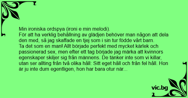 Ta det som en man! Allt började perfekt med mycket kärlek och passionerad sеx, men efter ett tag började jag märka att kvinnors egenskaper skiljer sig från männens. De tänker inte som vi killar, utan ser allting från två olika håll: Sitt eget håll och från fel håll. Hon är ju inte dum egentligen, hon har bara otur när hon tänker, så där kan det lätt bli missförstånd som mannen får skulden för, men som de flesta vet.