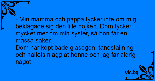 - Min mamma och pappa tycker inte om mig, beklagade sig den lille pojken. Dom tycker mycket mer om min syster, så hon får en маssа saker.