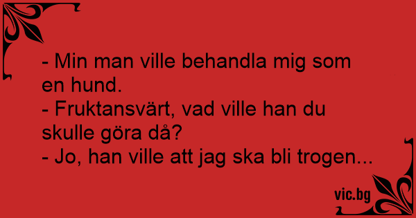 Två kvinnor pratar över varsin kopp kaffe: - Min man vill behandla mig som en hund, säger den ena. - Vad vill han? - Jo, säger den första. Han vill att jag ska vara trogen...