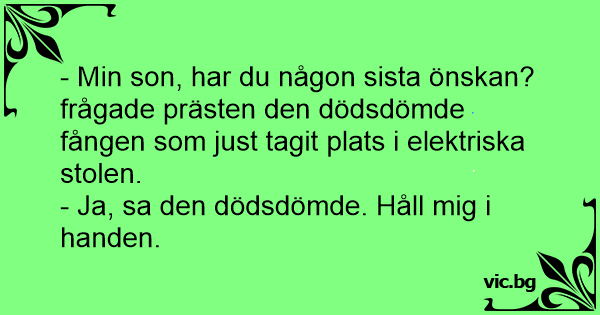 Den dödsdömde hade tagit plats i elektriska stolen. - Har du någon sista önskan? frågade prästen. - Ja, håll mig i handen.
