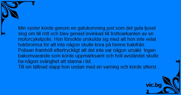 Min syster körde genom en gatukorsning just som det gula ljuset slog om till rött och blev genast invinkad till trottoarkanten av en motorcykelpolis. Hon försökte urskulda sig med att hon inte velat tvärbromsa för att inte någon skulle köra på henne bakifrån.