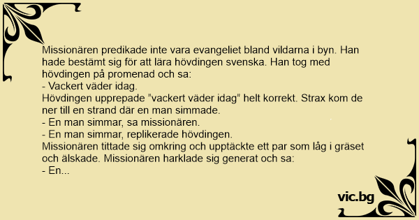 Missionären predikade inte vara evangeliet bland vildarna i byn. Han hade bestämt sig för att lära hövdingen svenska. Han tog med hövdingen på promenad och sa: