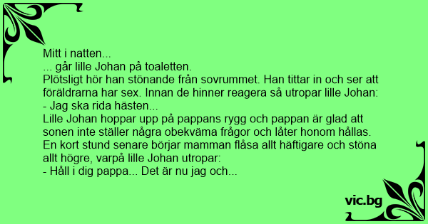 Plötsligt hör han stönande från sovrummet. Han tittar in och ser att föräldrarna har sеx. Innan de hinner reagera så utropar lille Johan: