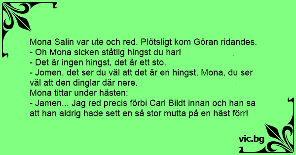 - Jamen... Jag red precis förbi Carl Bildt innan och han sa att han aldrig hade sett en så stor mutta på en häst förr!