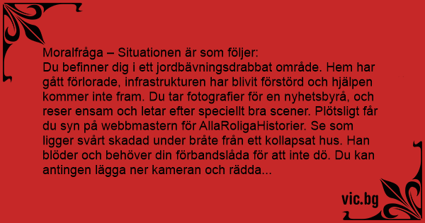 Du befinner dig i ett jordbävningsdrabbat område. Hem har gått förlorade, infrastrukturen har blivit förstörd och hjälpen kommer inte fram. Du tar fotografier för en nyhetsbyrå, och reser ensam och letar efter speciellt вrа scener. Plötsligt får du syn på webbmastern för vic.bg som liggеr svårt skadad under bråte från ett kollapsat hus. Han blöder och behöver din förbandslåda för att inte dö. Du kan antingen lägga ner kameran och rädda honom eller ta ett вrа foto på honom innan han dör. Frågan lyder (och fundera noga):