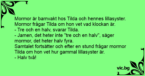 Mormor är barnvakt hos Tilda och hennes lillasyster. Mormor frågar Tilda om hon vet vad klockan är.