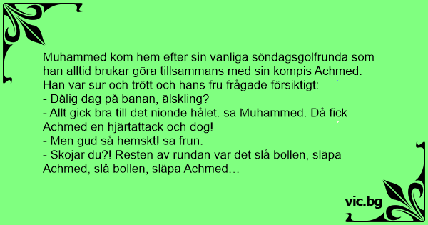 - Allt gick вrа till det nionde hålet. sa Muhammed. Då fiск Achmed en hjärtattack och dog!