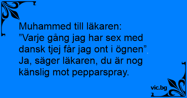 Turken kliver in hos läkaren och säger: - Stor problem! Varje gång jag pussar med fina svenska flicka, mitt ögon svider som fyfan, vara micket stor problem. Vaffö kompis? - Jaaa, sa läkaren.. Du...
