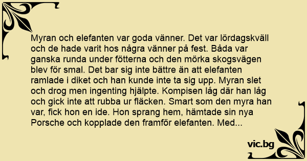 Myran och elefanten var goda vänner. Det var lördagskväll och de hade varit hos några vänner på fest. Båda var ganska runda under fötterna och den mörka skogsvägen blev för smal. Det bar sig inte bättre än att elefanten ramlade i diket och han kunde inte ta sig upp. Myran slет och drog men ingenting hjälpte. Kompisen låg där han låg och gick inte att rubba ur fläcken. Smart som den myra han var, fiск hon en ide. Hon sprang hem, hämtade sin nya Porsche och kopplade den framför elefanten. Med en rivstart var kompisen åter på vägen och båda kunde ta sig hem och vila ut. Nästa lördag, samma historia, men istället var det myran som var fullast och ramlade i diket. Elefanten kunde inte se kompisen nere i mörkret och vågade inte kliva ner med risk för att trampa på henne. Han ställde sig istället grensle över diket och hängde ner sin "sak". Han ropade till myran att ta tag, och utan problem lyfte han upp henne på vägen igen. Vad kan man då lära sig av detta?