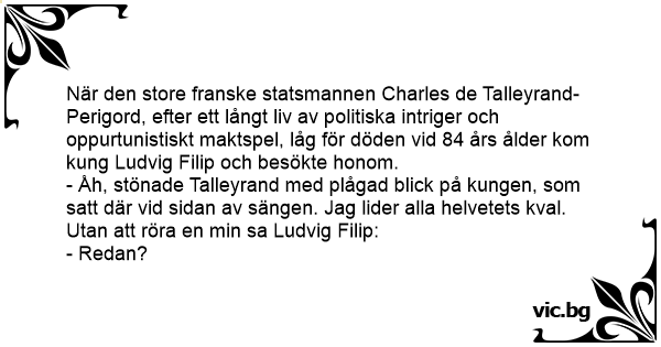 - Åh, stönade Talleyrand med plågad blick på kungen, som satt där vid sidan av sängen. Jag lider alla helvetets kval.