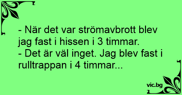 En norrman och en svensk stod och pratade: Svensken: - Igår när det var strömavbrott satt jag fast i hissen i tre timmar. Norrmannen: - Det var väl inget, jag stod i rulltrappan i fyra timmar...