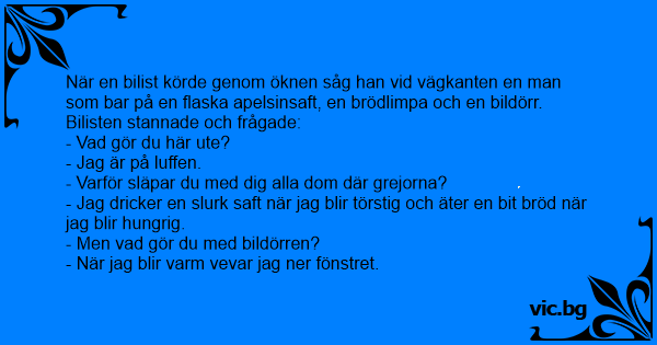 När en bilist körde genom öknen såg han vid vägkanten en man som bar på en flaska apelsinsaft, en brödlimpa och en bildörr. Bilisten stannade och frågade: