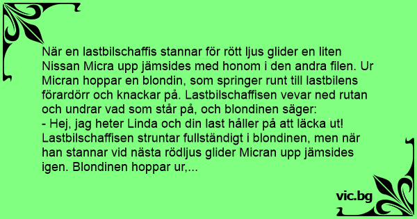 En lastbilschaufför stannade vid ett rödljus, då en röd Merca rullade upp bredvid honom och ut kom en liten yppig blondin. Hon sprang fram till hans dörr, knackade på och chaffisen öppnade. -...