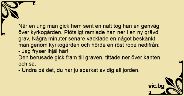 När en ung man gick hem sent en natt tog han en genväg över kyrkogården. Plötsligt ramlade han ner i en ny grävd grav. Några minuter senare vacklade en något beskänkt man genom kyrkogården och hörde en röst ropa nedifrån: