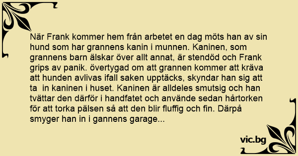När Frank kommer hem från arbetet en dag möts han av sin hund som har grannens kanin i munnen. Kaninen, som grannens barn älskar över allt annat, är stendöd och Frank grips av panik. övertygad om att grannen kommer att kräva att hunden avlivas ifall saken upptäcks, skyndar han sig att ta in kaninen i huset. Kaninen är alldeles smutsig och han tvättar den därför i handfatet och använde sedan hårtorken för att torka pälsen så att den blir fluffig och fin. Därpå smyger han in i gannens garage och lägger kaninen i dess bur och smyger lika tyst och skyndsamt därifrån i förhoppningen att hans granne ska tro att kaninen dött en naturlig död.