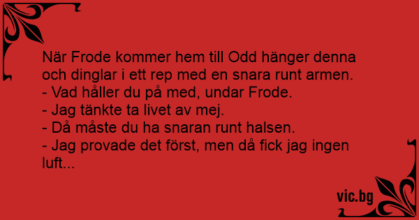 När Ole kommer för att besöka Vegard så hittar han honom hängandes i ett rep runt armen. - Vad håller du på med? Undrar Ole. - Jag försöker ta livet av mej! Svarar Vegard. - Men då måste du ju ha...