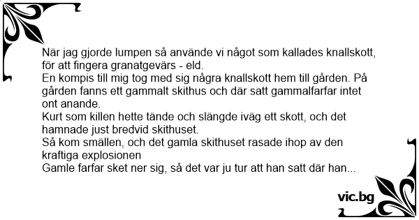 En kompis till mig tog med sig några knallskott hem till gården. På gården fanns ett gammalt skithus och där satt gammalfarfar intet ont anande.