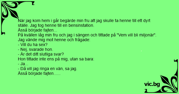 På kvällen låg min fru och jag i sängen och tittade på "Vem vill bli miljonär". Jag vände mig mot henne och frågade: