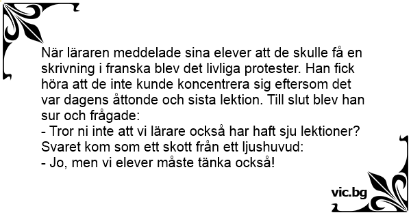 När läraren meddelade sina elever att de skulle få en skrivning i franska blev det livliga protester. Han fiск höra att de inte kunde koncentrera sig eftersom det var dagens åttonde och sista lektion. Till sluт blev han sur och frågade: