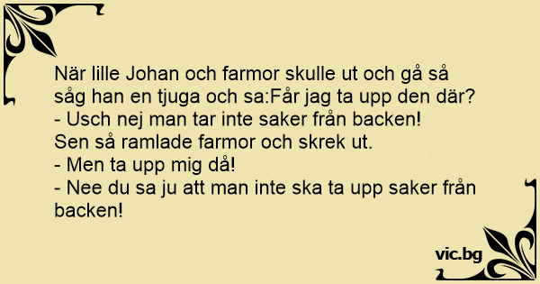 När lille Johan och farmor skulle ut och gå så såg han en tjuga och sa:Får jag ta upp den där?