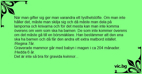 När man gifter sig ger man varandra ett tysthetslöfte. Om man inte håller det, måste man skilja sig och då måste man dela på lamporna och knivarna och för det mesta kan man inte komma överens om vem som ska ha barnen. De som inte kommer överens om det måste gå till en börsmäklare. Han bestämmer att den ena ska ha barnen och då får den andra ett extra matbord istället.