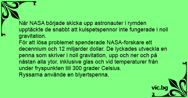 För att lösa problemet spenderade NASA-forskare ett decennium och 12 miljarder dollar. De lyckades utveckla en penna som skriver i noll gravitation, upp och ner och på nästan alla ytor, inklusive glas och vid temperaturer från under fryspunkten till 300 grader Celsius.