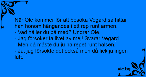 När Frode kommer hem till Odd hänger denna och dinglar i ett rep med en snara runt armen. - Vad håller du på med, undar Frode. - Jag tänkte ta livet av mej. - Då måste du ha snaran runt halsen....
